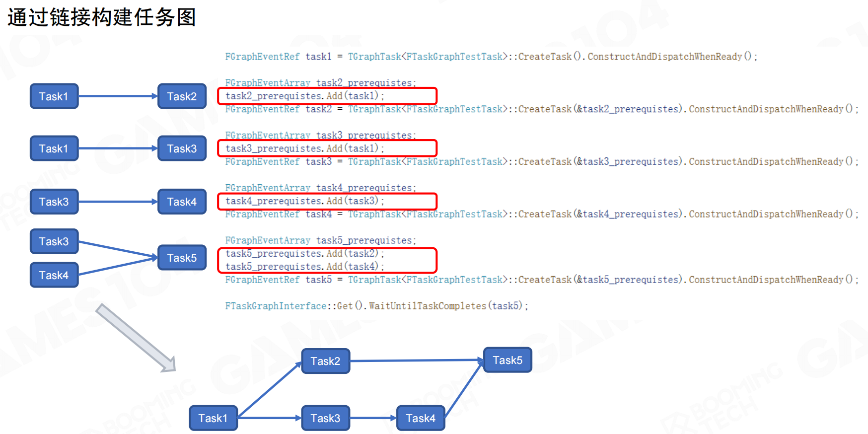 任务图的构建通过代码链接实现:定义Task1(无依赖),Task2依赖Task1,Task3依赖Task1,Task4依赖Task3,Task5依赖Task2和Task4。系统解析依赖图后自动执行。