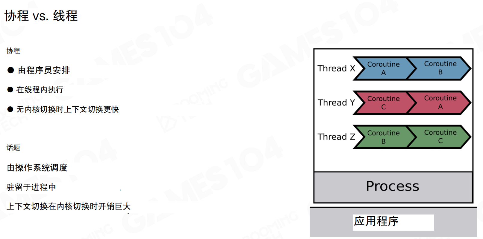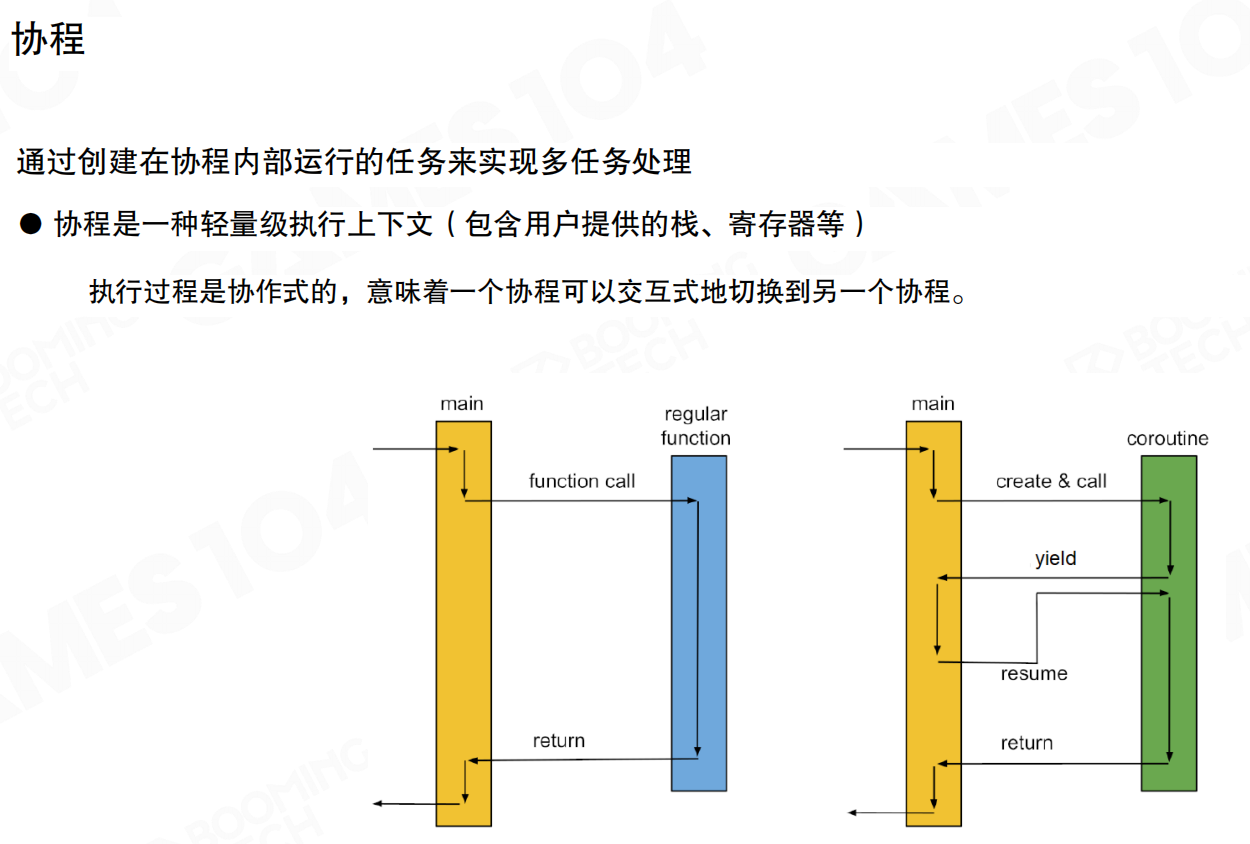 现代游戏引擎的任务系统(Job System)基于协程(Coroutine)实现。协程是轻量级执行上下文,包含用户提供的栈、寄存器等。函数执行过程中可通过yield操作让出执行权,稍后通过resume恢复执行,从上次暂停处继续。执行过程是协作式的,协程可交互式切换。