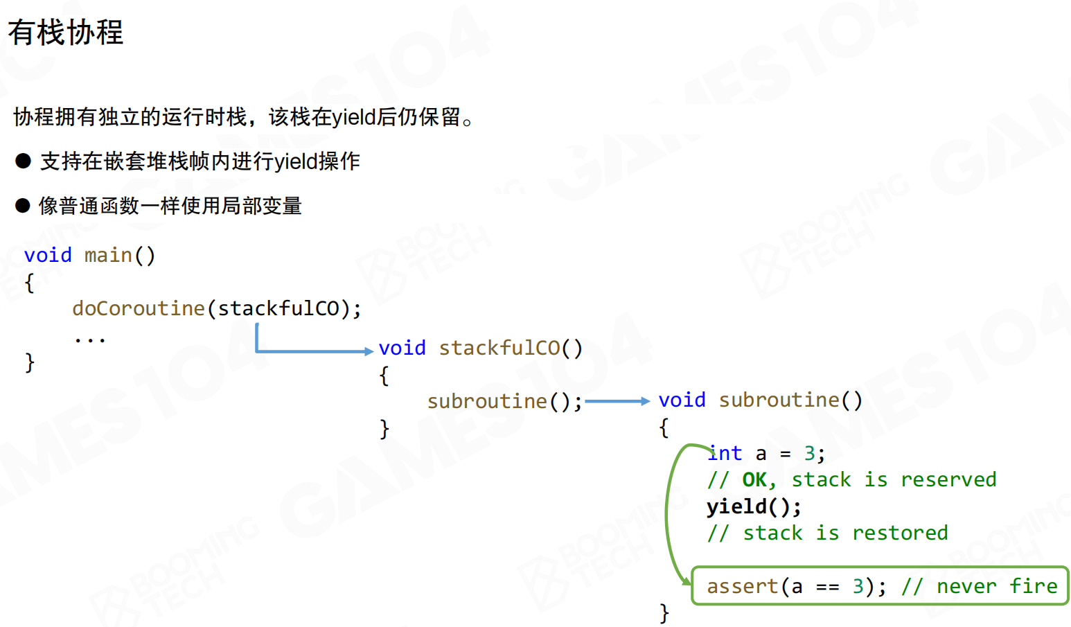 有栈协程拥有独立的运行时栈,该栈在yield后仍保留。支持在嵌套堆栈帧内进行yield操作,可像普通函数一样使用局部变量。协程恢复时,所有局部变量和计算状态完整恢复。