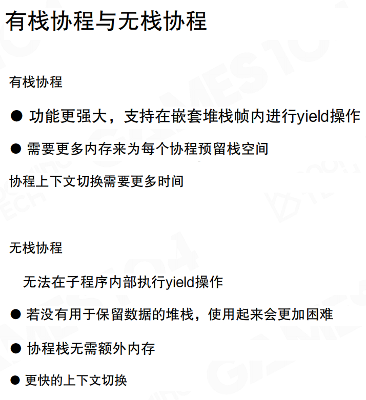 协程有两种实现方式:有栈协程(Stackful Coroutines)和无栈协程(Stackless Coroutines)。