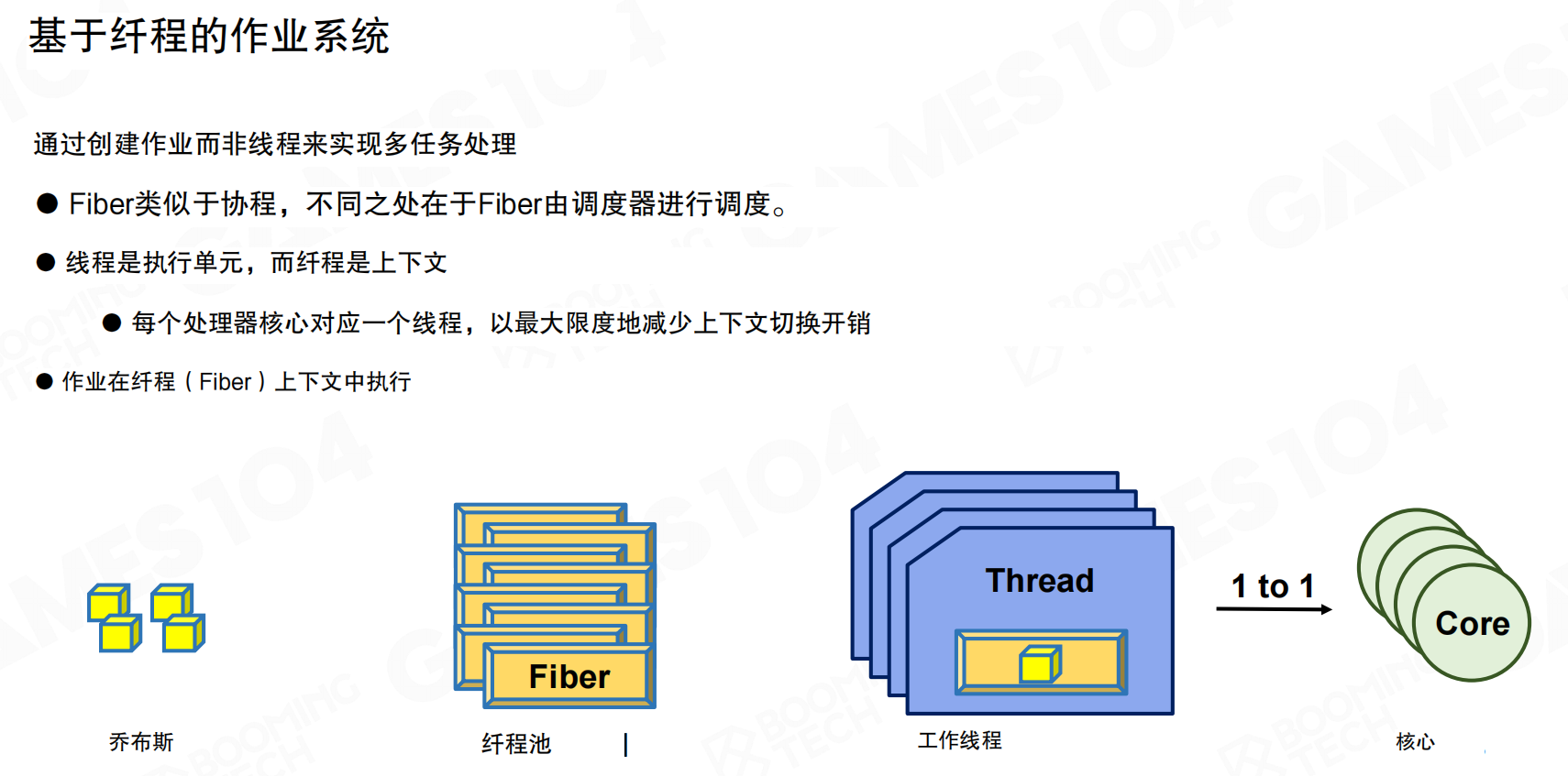 基于协程思想可实现基于纤程的作业系统(Fiber-based Job System)。作业(Job)通过纤程(Fiber)执行。Fiber类似于协程,区别在于Fiber由调度器调度。线程是执行单元,纤程是上下文。每个处理器核心对应一个线程,以最小化上下文切换开销。作业在纤程上下文中执行。