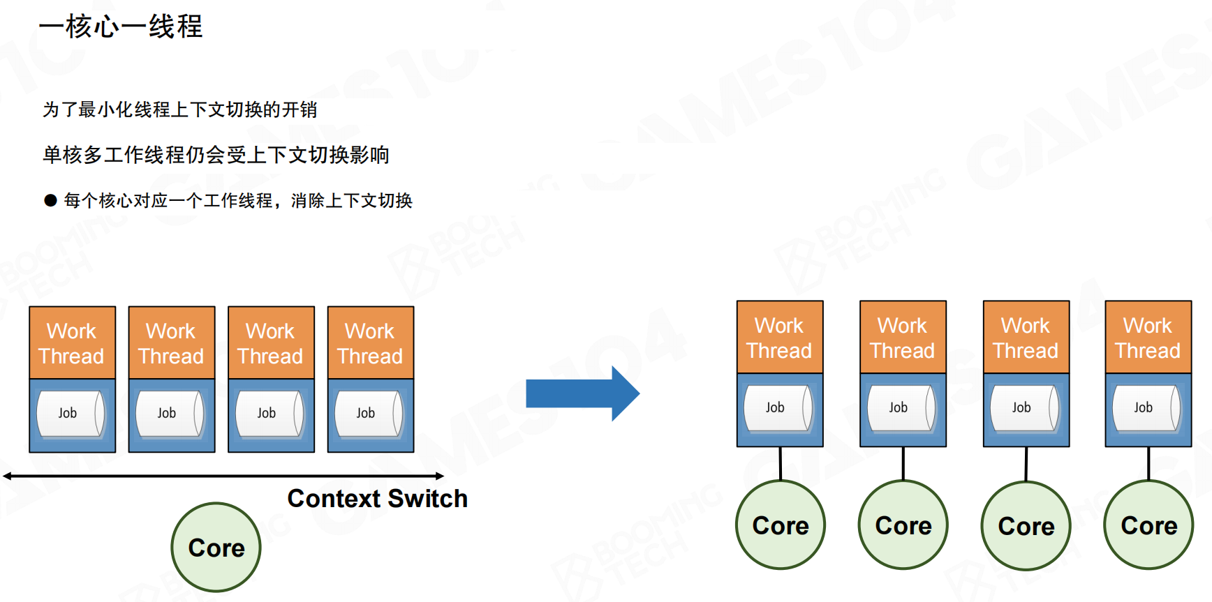 更严重的是缓存失效问题:切换后的线程数据不在各级缓存中,需要从内存重新加载,这个过程可能需要1万到100万个周期。因此,线程上下文切换实际上非常昂贵,这也是为什么后续要讲的Job System采用Fiber架构的原因。