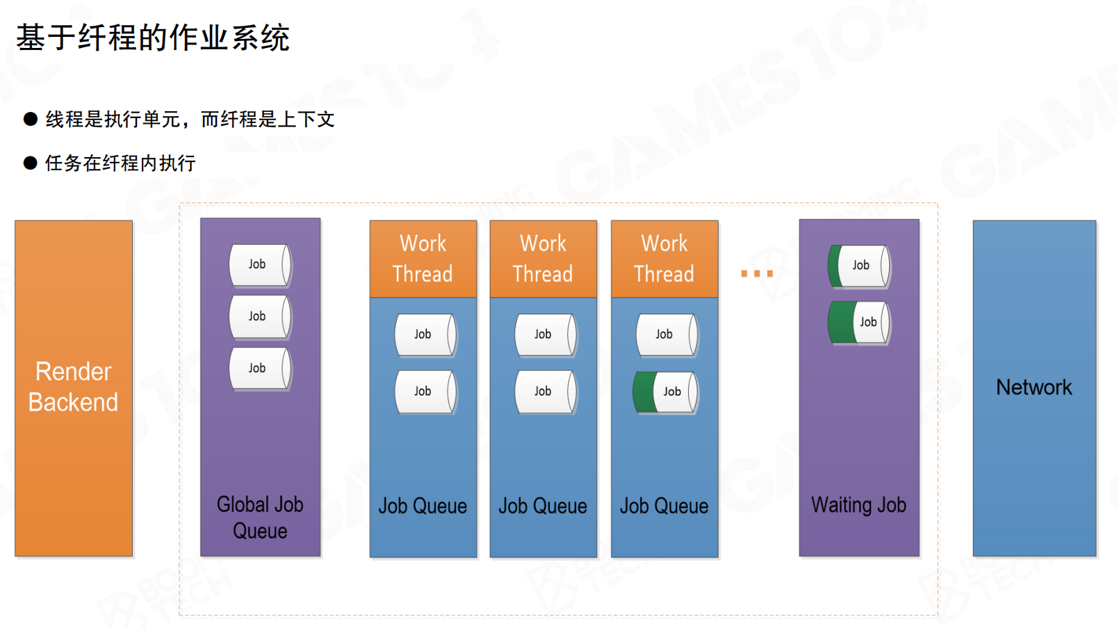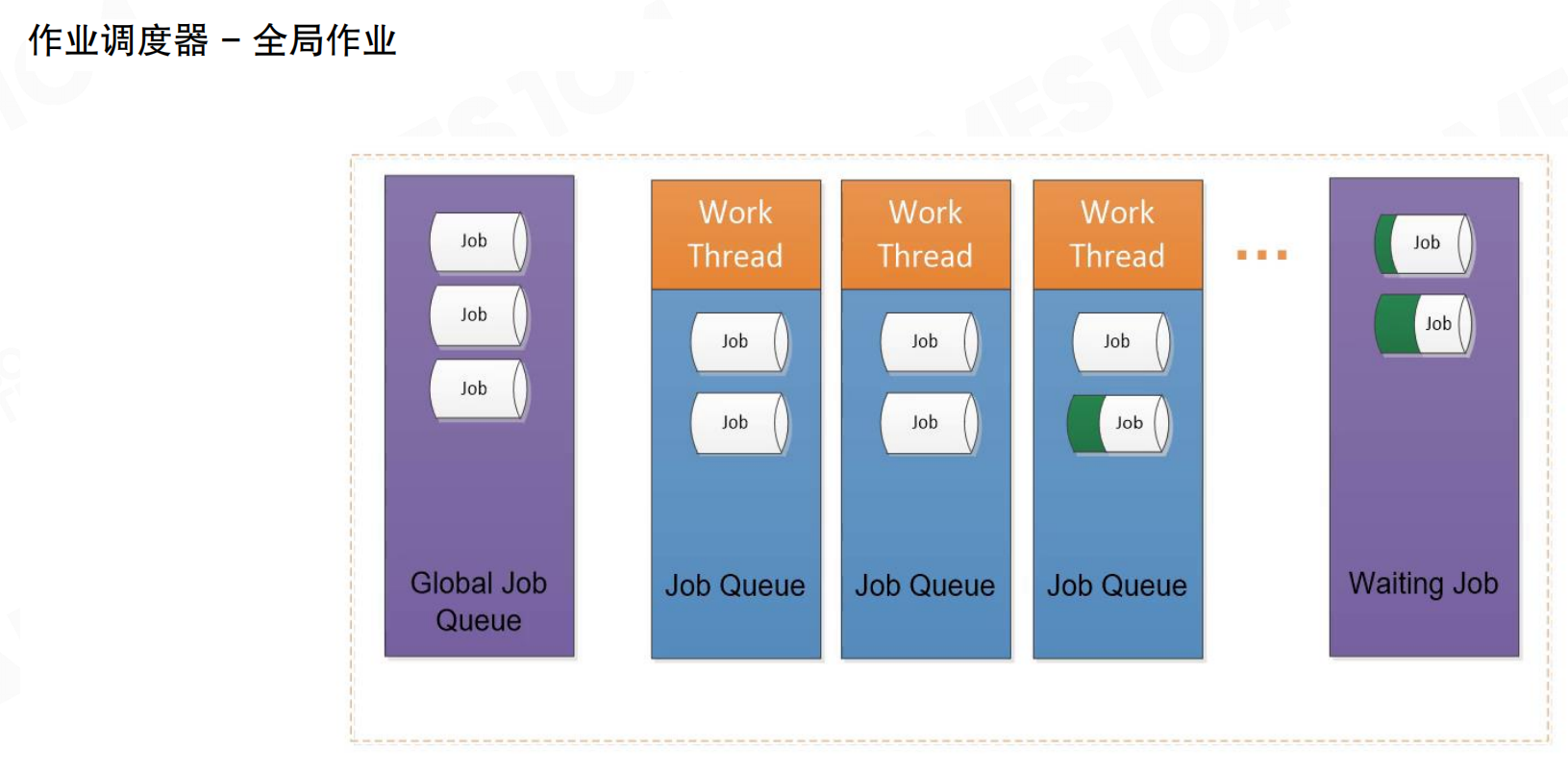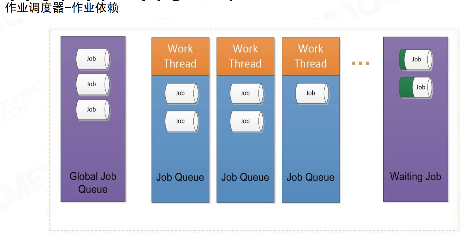 系统根据程序需要生成大量Job,调度器根据线程负载分配到合适的线程及线程上的Fiber中。系统包含全局作业队列(Global Job Queue)、各工作线程的作业队列(Job Queue)和等待作业队列(Waiting Job)。作业从全局队列分配到各工作线程,执行完成后可能进入等待队列。