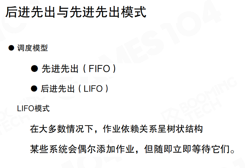 Job执行顺序分为FIFO(先进先出)和LIFO(后进先出)两种模式。游戏引擎实践中通常选择LIFO模式。游戏引擎中,许多Job的产生是前一个Job执行到一半时fork出多个新Job,这些新Job执行过程中又可能fork出更多Job。它们之间存在依赖关系,fork出的任务未完成时,自身无法完成。因此采用后进先出的堆栈方式。