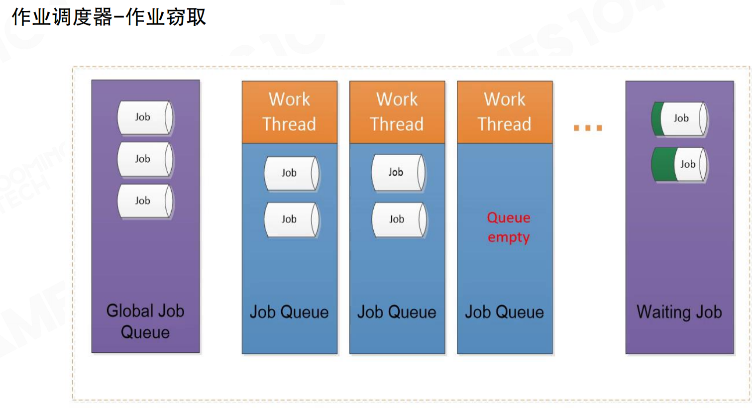 线程闲置时,调度器将其他线程中的Job移动到闲置线程进行计算。这是作业窃取(Job Stealing)机制。无论调度器设计多好,实际仍无法准确估计每个任务的执行时间,因为任务运算复杂度、IO等待、依赖关系都可能导致执行时间不可预测。必然出现部分工作线程已完成、部分仍有大量任务的情况。调度器将未完成线程中的任务”窃取”到空闲线程中执行。