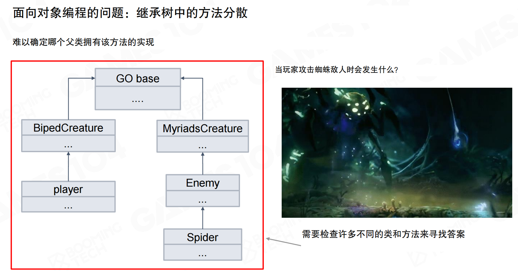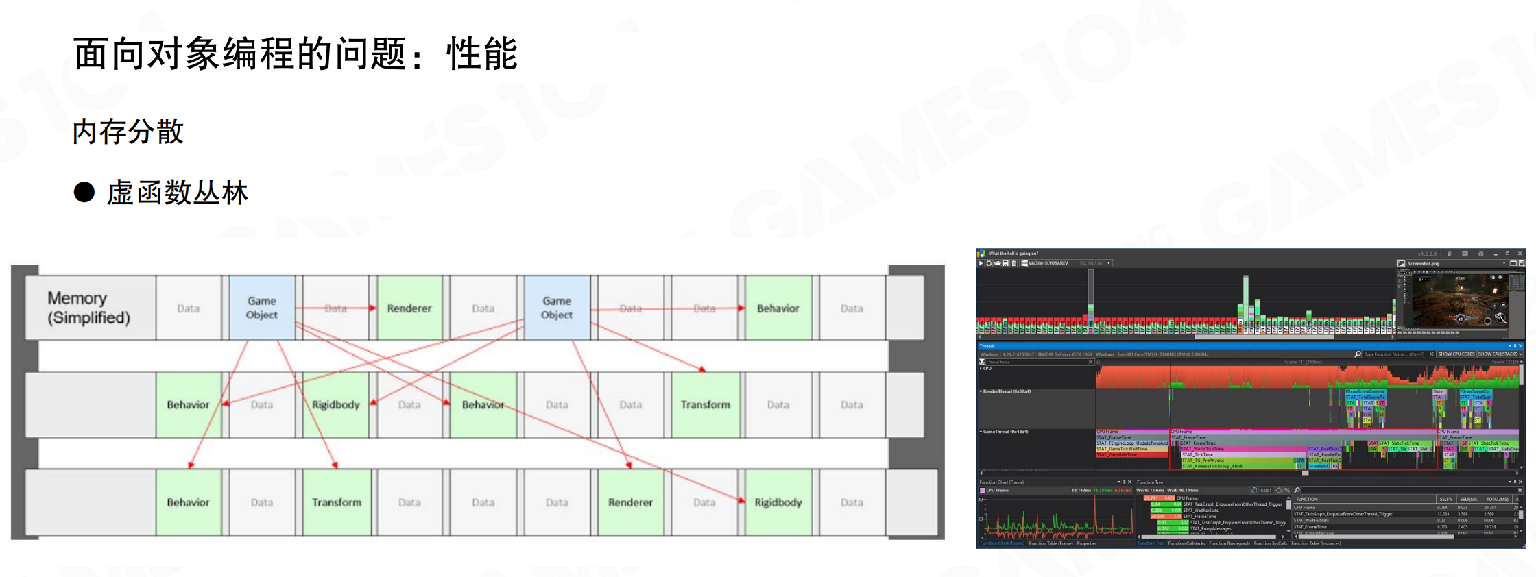 前面介绍过基于OOP的组件编程,通过继承实现具体的GameObject。这种编程范式效率较低:代码分散在各个类中,虚函数调用频繁,数据分散存储,导致大量缓存未命中。