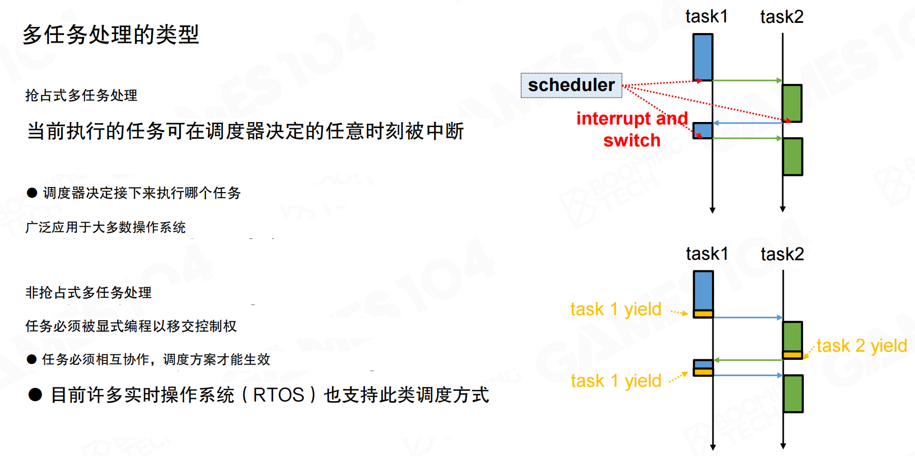非抢占式多任务处理(Non-Preemptive Multitasking):任务必须被显式编程以移交控制权。任务必须相互协作,调度方案才能生效。这种方式在操作系统中很少用,但在一些实时操作系统(RTOS)中也有应用。