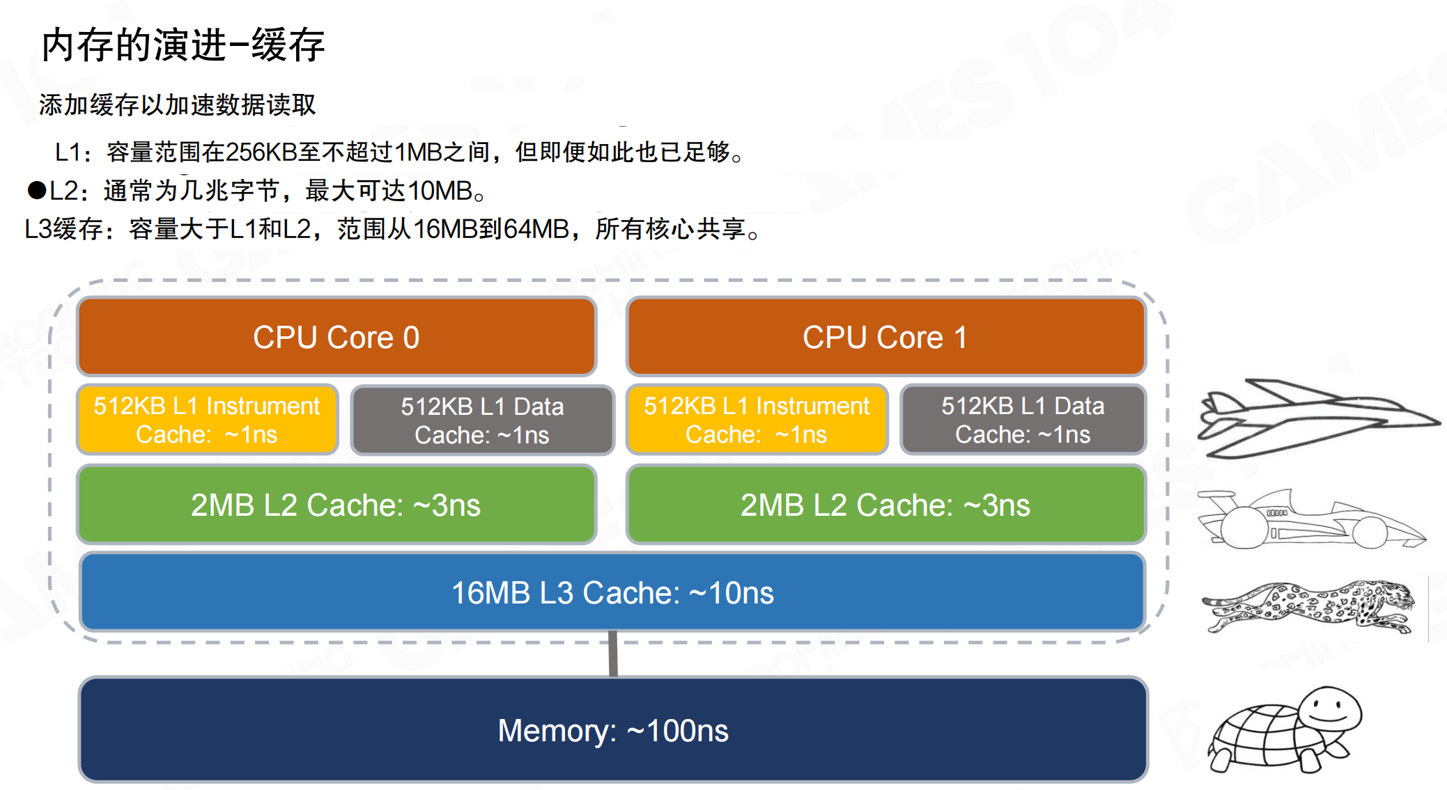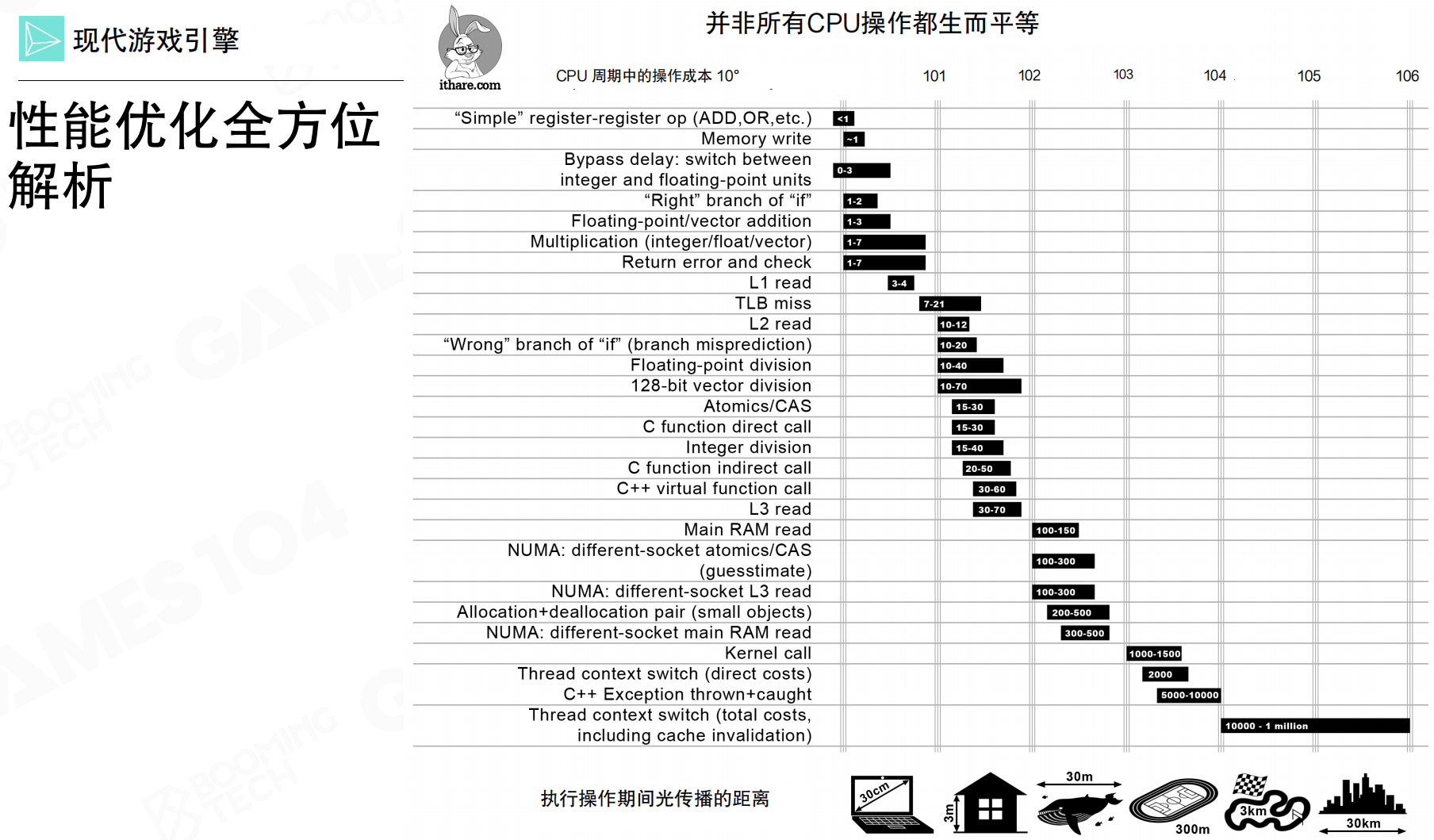 游戏引擎对性能要求极高,实现超高性能编程需要深入理解硬件:CPU、内存、缓存的协作机制。这张图是理解高性能编程的关键。系统架构师需要深入理解图中每个操作的开销,这是基本功。
