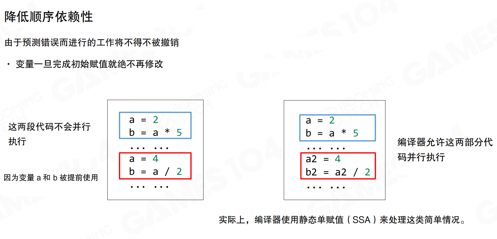减少顺序依赖性(Reduce Sequential Dependencies)是并行化的前提。如果代码段之间存在变量依赖(同一变量被重新赋值),就无法并行执行。