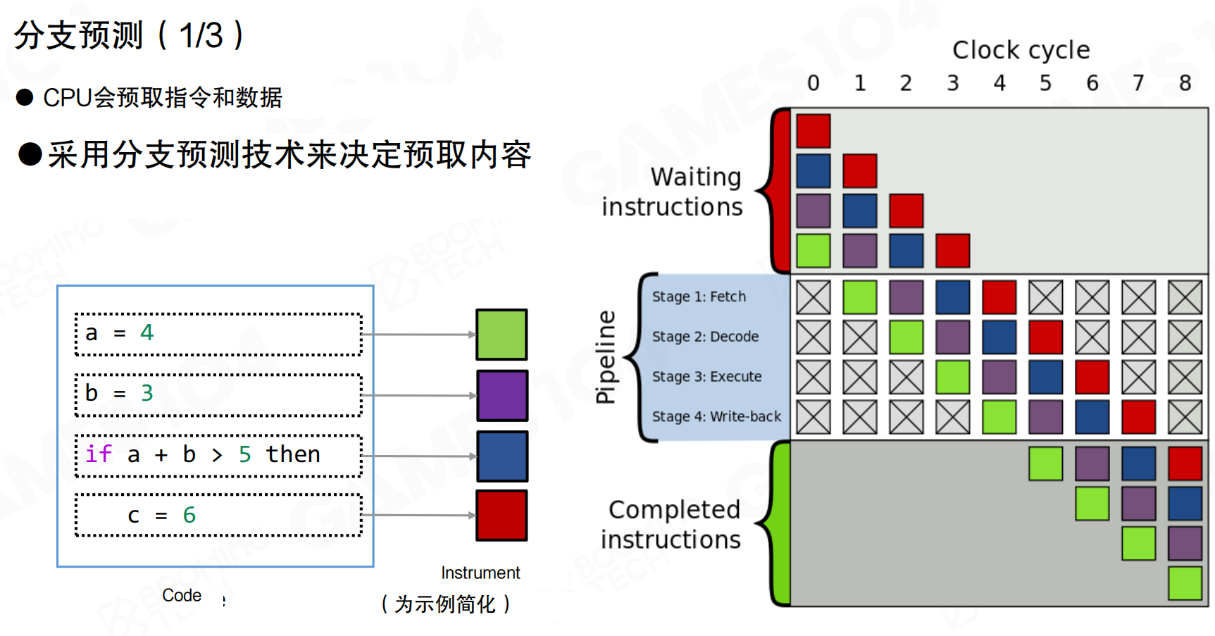 当遇到分支语句(如if-else)时,CPU会预测最可能执行的分支,提前将该分支的指令加载到L1缓存中。如果预测正确,流水线可以连续执行;如果预测错误,需要清空流水线,从内存重新加载正确分支的指令,造成性能损失。