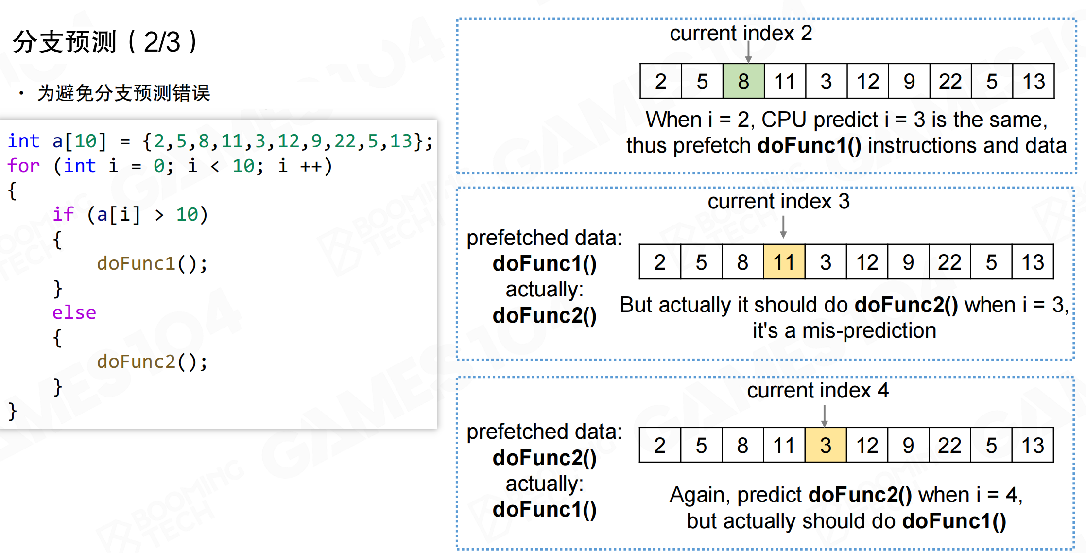 分支预测错误会导致严重的性能下降。例如,循环中根据数组元素值选择执行doFunc1()或doFunc2()。CPU基于历史模式预测下一个分支,但如果数据模式不规则,预测会频繁出错。