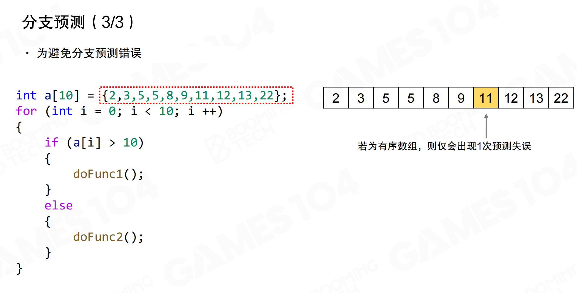 如果数据是有序数组,分支预测错误会大幅减少。例如,将数组排序后,小于等于10的元素在前,大于10的元素在后。CPU只需要在分界点处预测错误一次,之后的分支预测都会正确。