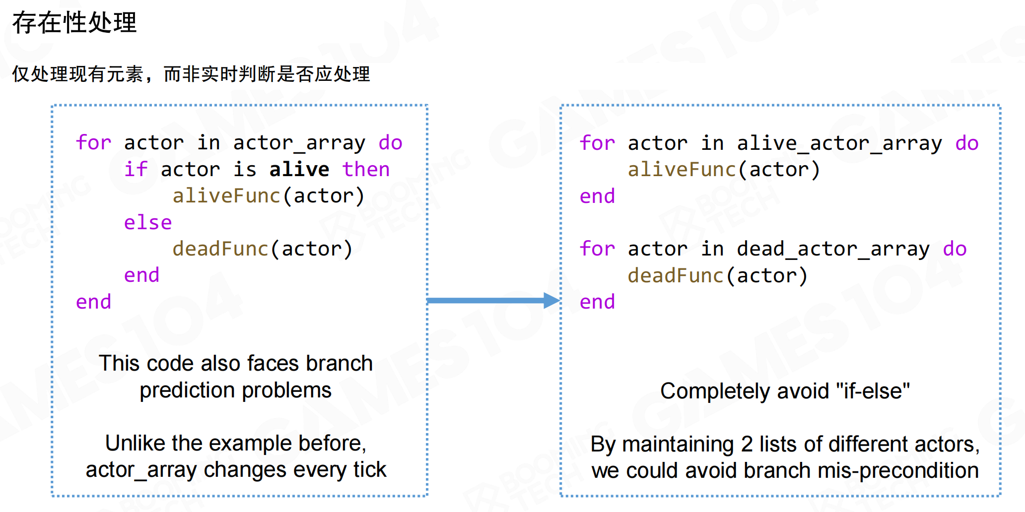 例如,处理actor数组时,如果需要在循环中判断if actor is alive then,会导致分支预测问题。优化方案是维护两个独立的数组:alive_actor_array和dead_actor_array。创建actor时根据状态加入对应数组,处理时分别遍历两个数组,完全避免if-else判断。