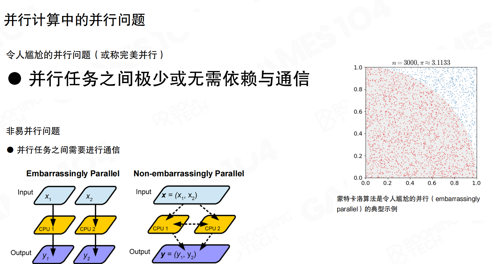 令人尴尬的并行问题(Embarrassingly Parallel,也称完美并行):并行任务之间极少或无需依赖与通信。每个任务独立完成,最后汇总结果即可。典型的例子是蒙特卡洛模拟,每个采样点的计算完全独立。