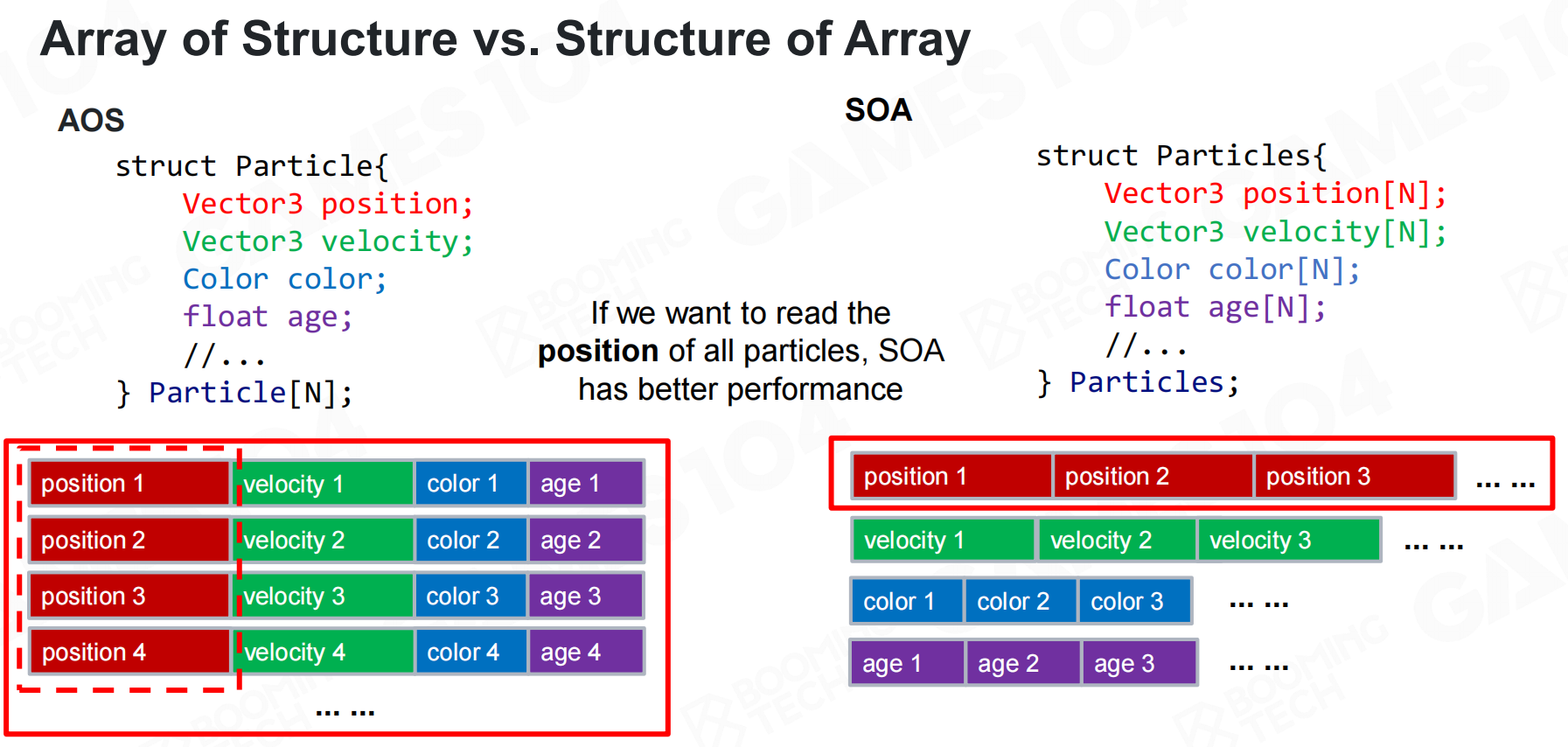 如果程序需要读取所有粒子的position,AOS会产生大量cache miss,因为每次读取position都要跳过velocity、color、age等数据。SOA中所有position数据连续存储,访问时缓存命中率高,性能更好。