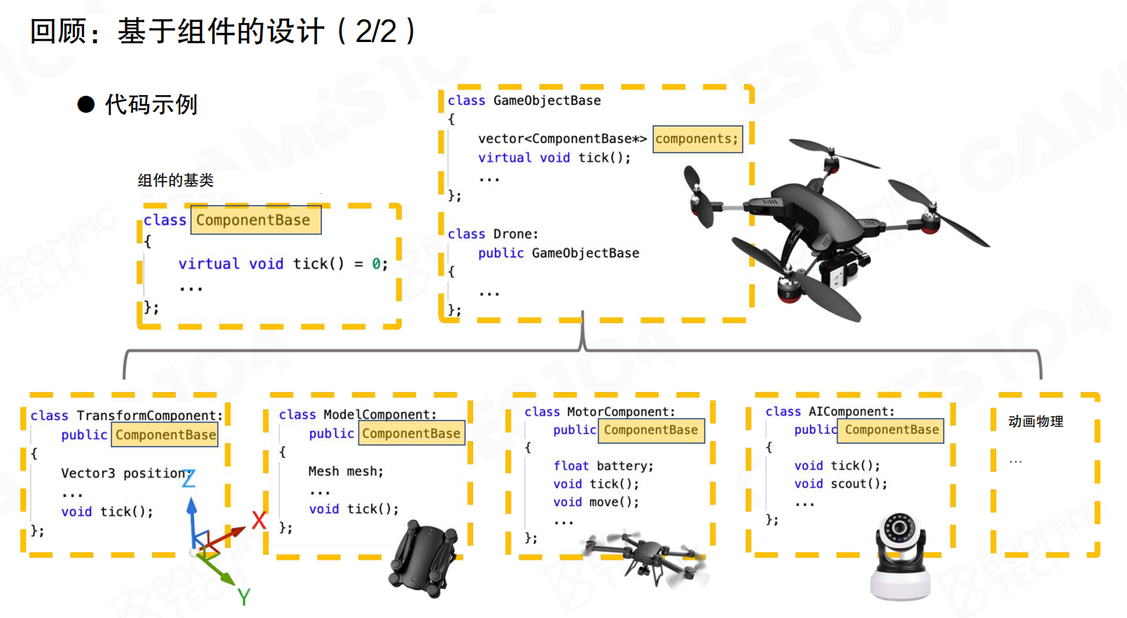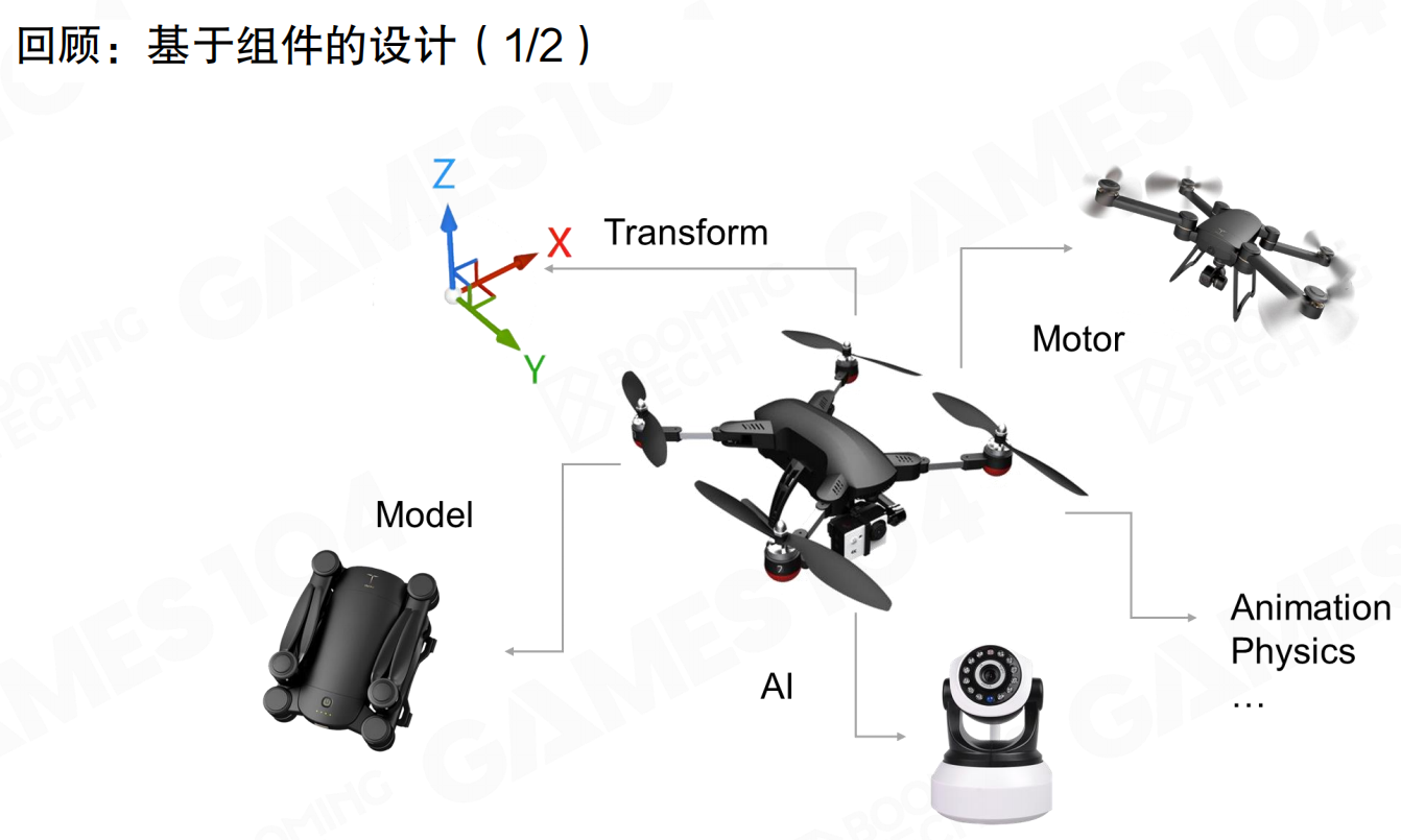 基于组件的设计中,GameObject通过组合不同的Component实现功能。例如无人机包含Transform、Model、Motor、AI等组件,每个组件负责特定功能。
