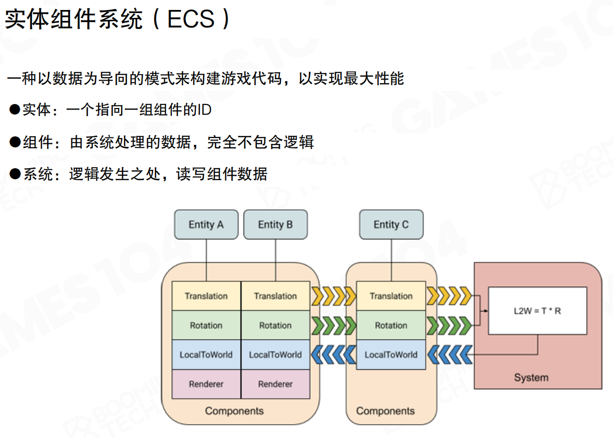 - 实体组件系统(ECS):提供面向数据编程框架,重新以数据为导向组织计算框架。