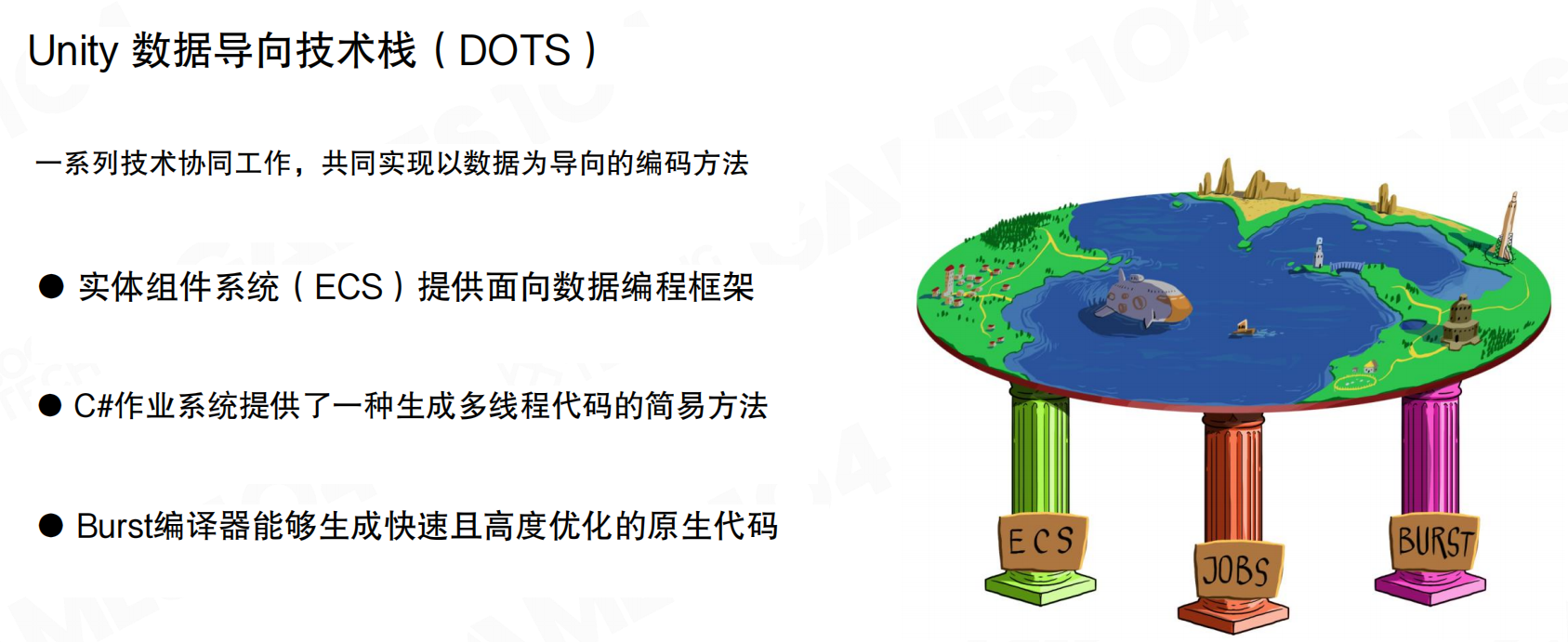 Unity的数据导向技术栈(Data-Oriented Technology Stack,DOTS)基于ECS架构实现,结合C#任务系统进行并行化,并设计了Burst编译器优化代码。