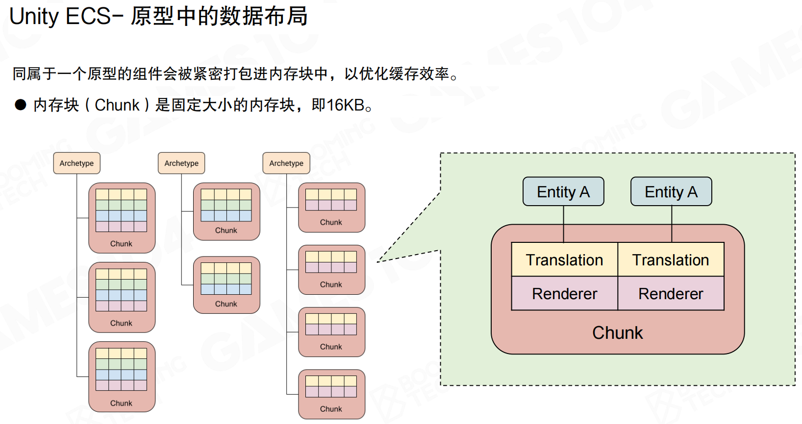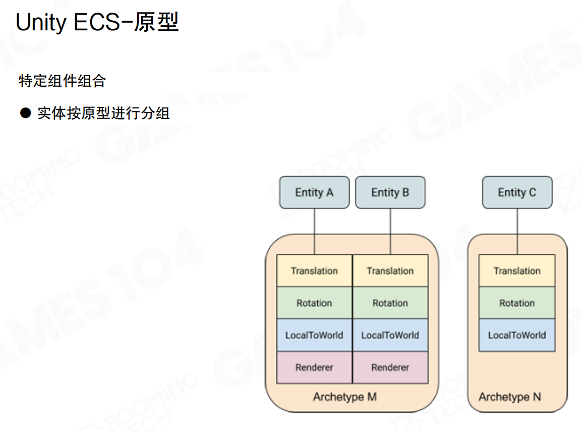 Unity ECS设计了原型(Archetype)对不同类型的Entity进行抽象。特定组件组合对应一个Archetype,实体按原型进行分组。