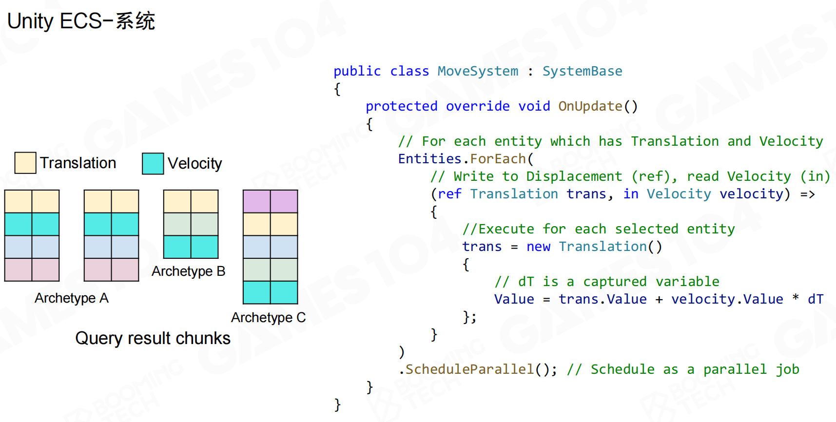 Unity ECS中的System通过Entities.ForEach查询具有特定组件的Entity,然后对它们执行逻辑。例如MoveSystem查询具有Translation和Velocity组件的Entity,更新位置。