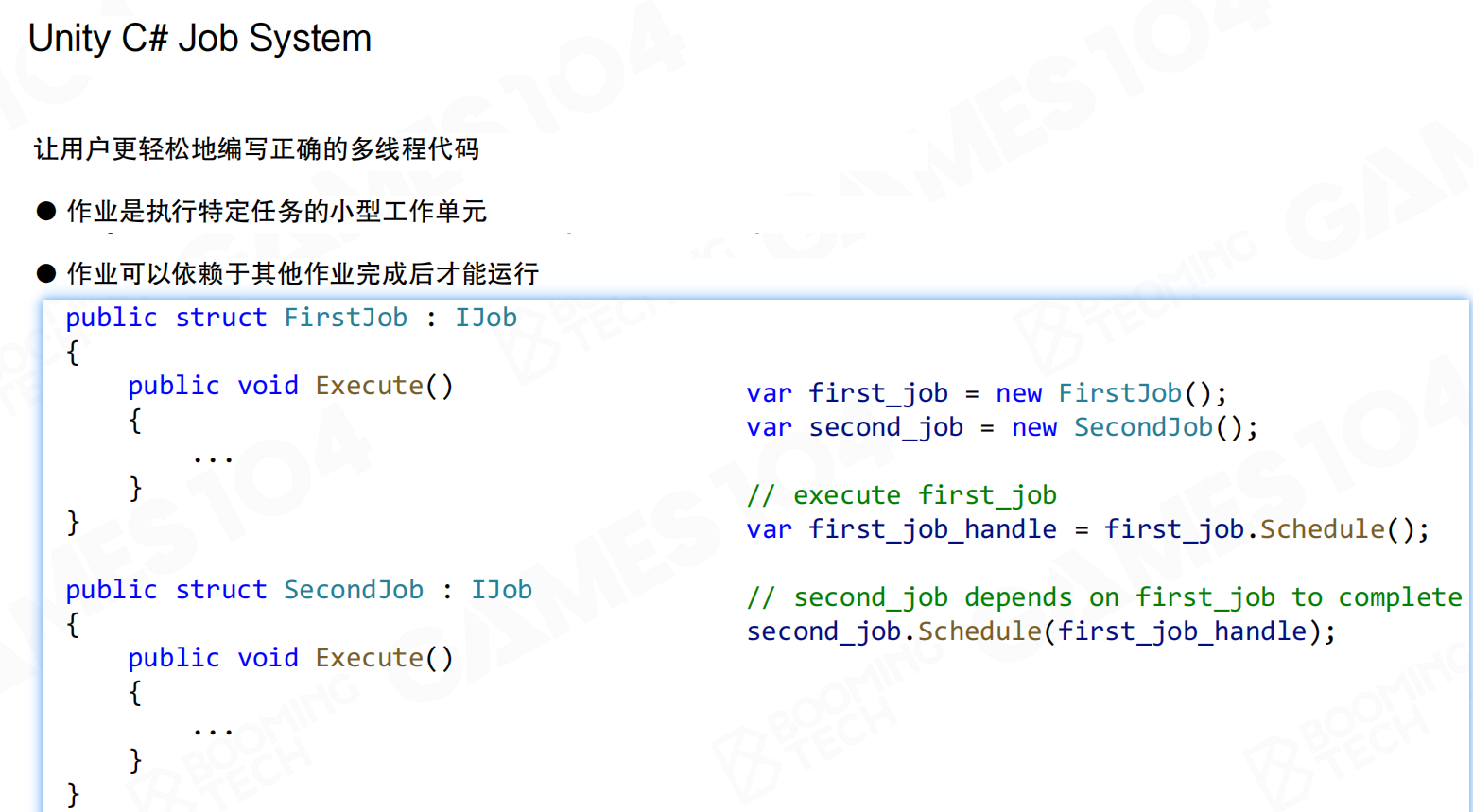 Unity C#作业系统让用户更轻松地编写正确的多线程代码。作业是执行特定任务的小型工作单元,作业可以依赖于其他作业完成后才能运行。