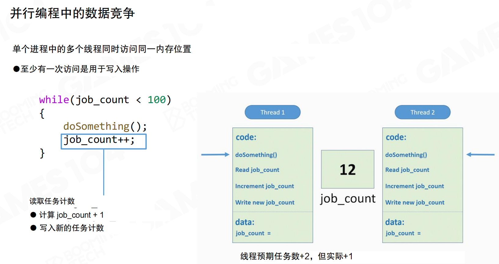 例如,job_count++看似是一个操作,实际上包含三个步骤:读取任务计数、计算job_count+1、写入新的任务计数。如果两个线程同时执行这个操作,可能都读取到相同的初始值,各自加1后写回,导致其中一个增量丢失。线程预期任务数+2,但实际只+1。