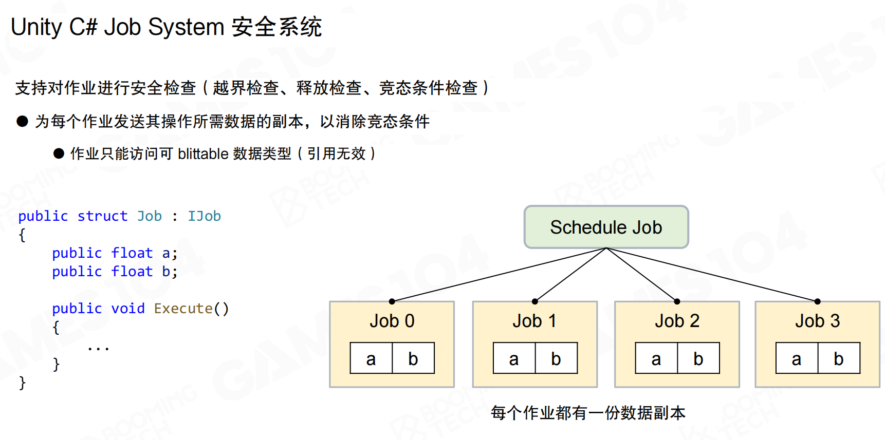 Unity C#作业系统支持对作业进行安全检查:越界检查、释放检查、竞态条件检查。为每个作业发送其操作所需数据的副本,以消除竞态条件。作业只能访问可blittable数据类型(引用无效)。
