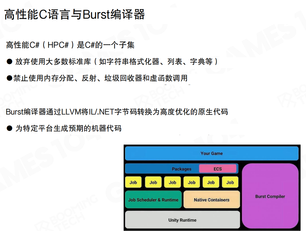 - Burst编译器:生成快速且高度优化的原生代码,将IL/.NET字节码转换为高度优化的原生代码。