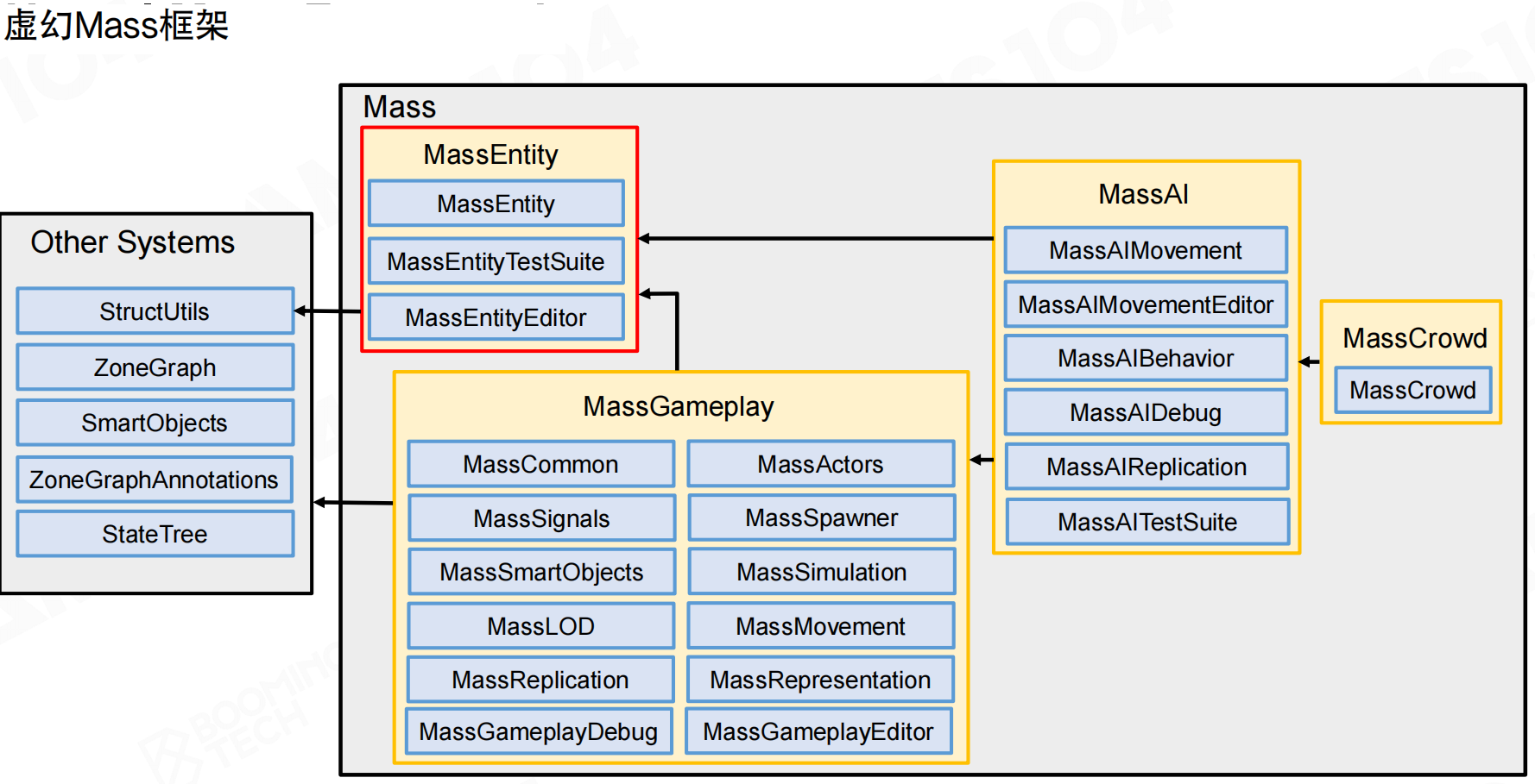 虚幻引擎使用Mass系统实现ECS架构。Mass系统包含MassEntity、MassGameplay、MassAI、MassCrowd等模块,与StructUtils、ZoneGraph、SmartObjects、State Tree等外部系统集成。