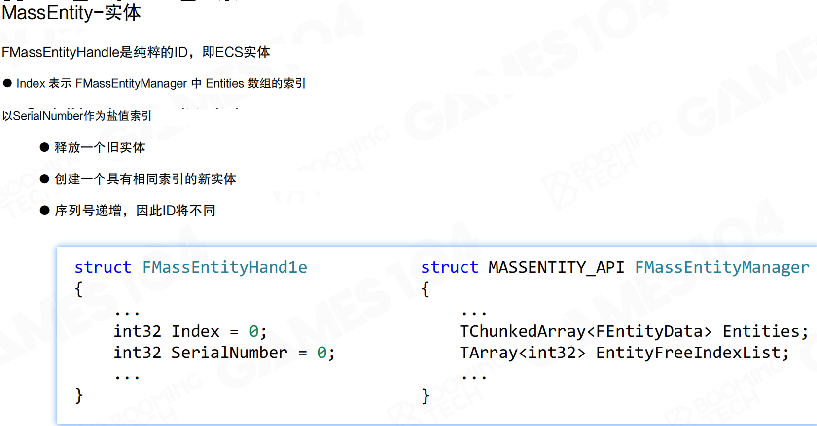Mass系统中的Entity是FMassEntityHandle,它是纯粹的ID。Index表示FMassEntityManager中Entities数组的索引,SerialNumber作为盐值索引。