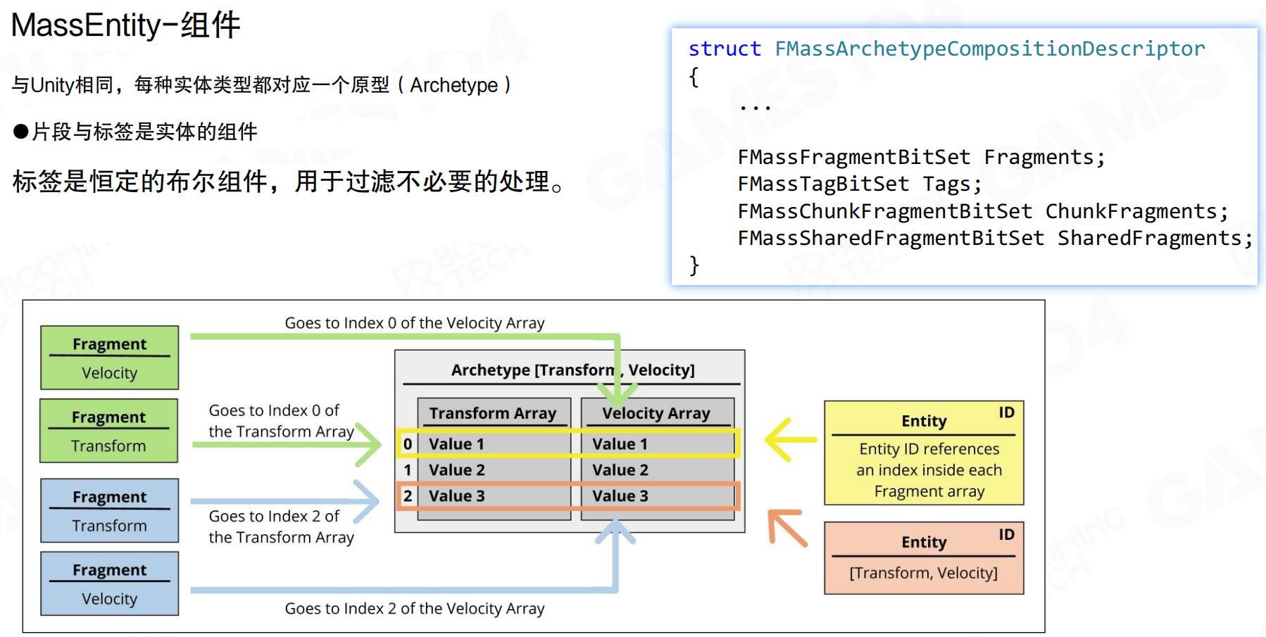 Mass系统中的Component称为Fragment,强调它只具有数据的属性。与Unity相同,每种实体类型都对应一个原型(Archetype)。片段与标签是实体的组件,标签是恒定的布尔组件,用于过滤不必要的处理。