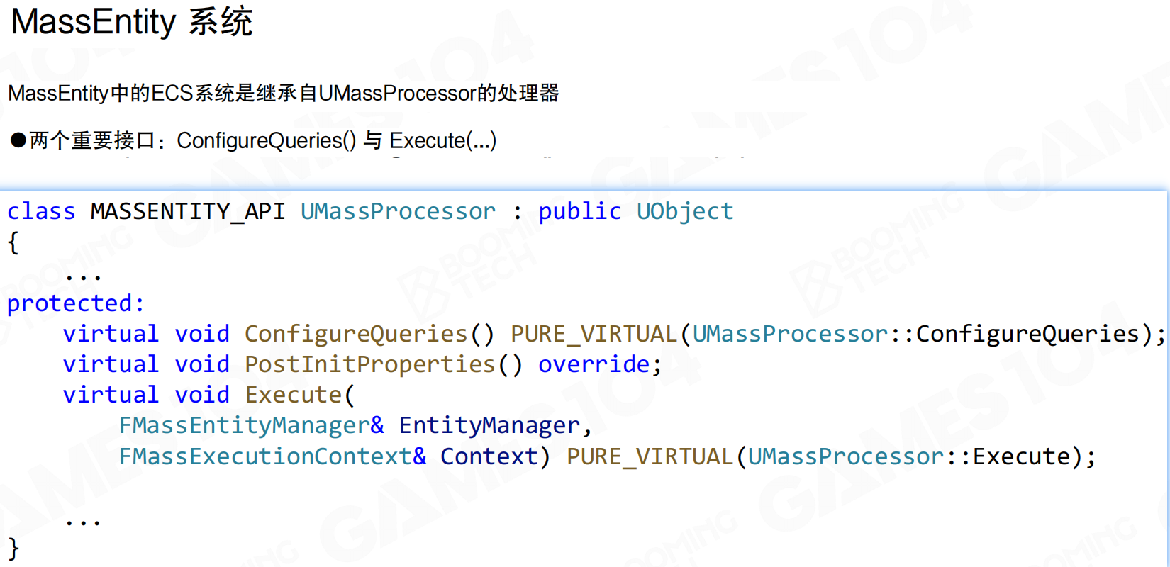 Mass系统中的System称为Processor,表示它只承担业务逻辑的功能。Processor继承自UMassProcessor,需要实现两个重要接口:ConfigureQueries()和Execute(...)。