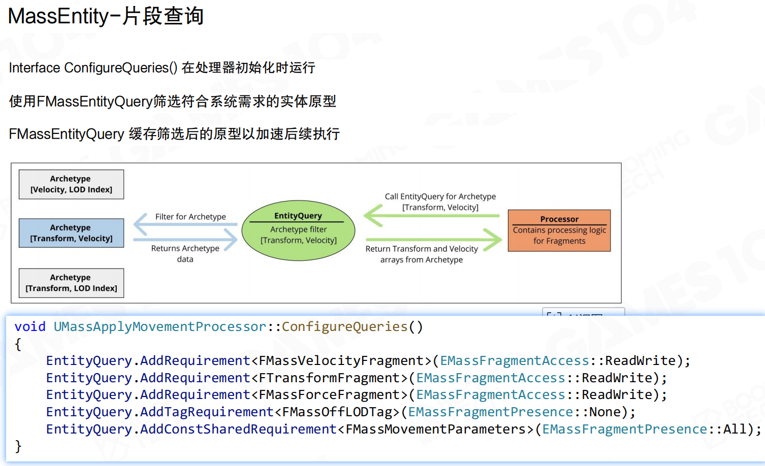 ConfigureQueries()使用FMassEntityQuery过滤满足系统要求的Entity Archetype。FMassEntityQuery会缓存这些过滤后的Archetype,加速后续执行。
