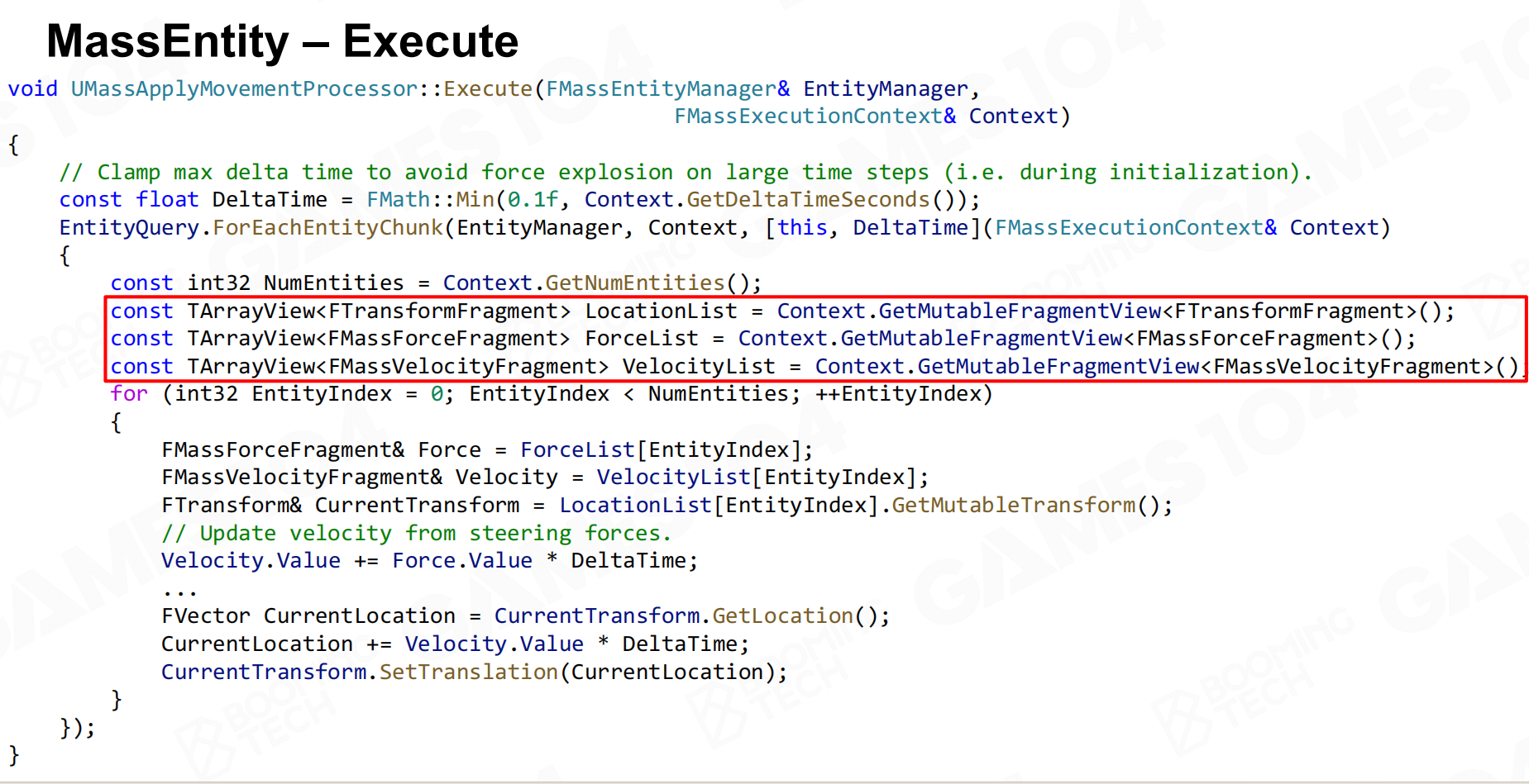 Execute()方法中,Processor通过EntityQuery.ForEachEntityChunk()按Chunk处理Entity。对每个Chunk,获取Fragment的数组视图(如TArrayView<FTransformFragment>、TArrayView<FMassVelocityFragment>),然后遍历Chunk中的每个Entity,更新其数据。