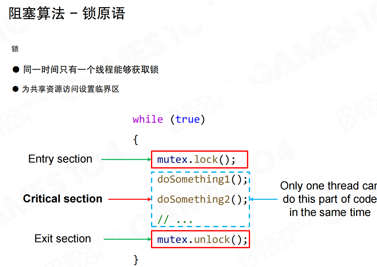 进入临界区前调用mutex.lock(),退出时调用mutex.unlock()。临界区内的代码保证同一时间只有一个线程在执行,其他需要访问同一内存的线程会被强制等待。