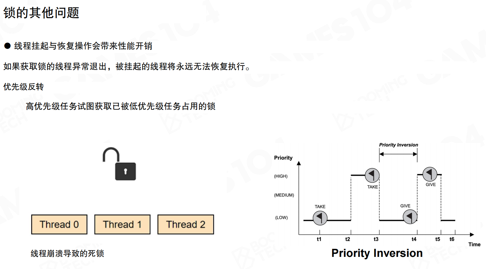 优先级反转(Priority Inversion):高优先级任务试图获取已被低优先级任务占用的锁时,高优先级任务实际上被低优先级任务阻塞,导致优先级反转。