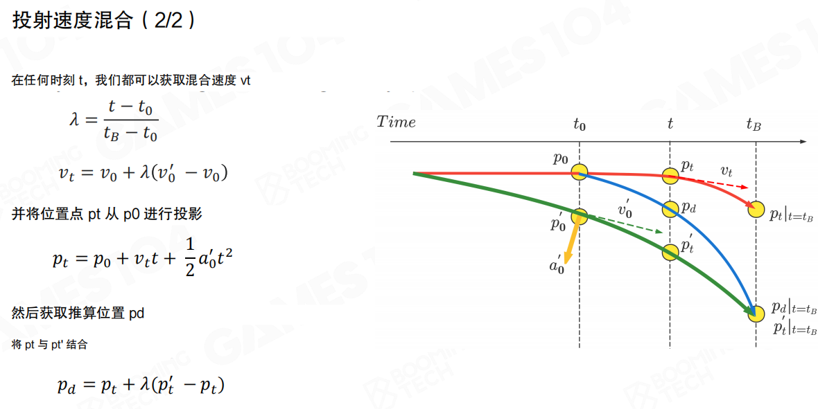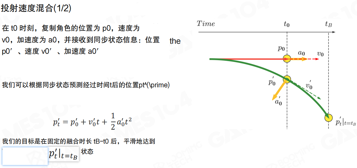 把外推落到游戏里,一个常见方法是 投射速度融合(Projective Velocity Blending,PVB)。它的目标不是“立刻纠正到服务器状态”,而是在一个固定的融合时长内,把复制体平滑拉回服务器给出的轨道。