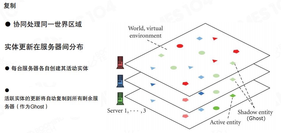 当单纯的分区还不够(例如某些区域玩家密度过高),会引入“复制”的思路:多台服务器协同处理同一片世界区域。