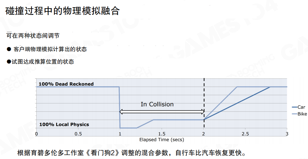 一种常见的工程解法不是“坚持外推到底”,而是 切换权重:在碰撞窗口内,把控制权更多交给本地物理(Local Physics);碰撞结束后,再逐渐回到外推/同步结果,避免穿插与分离力爆炸。