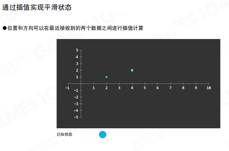 内插的直觉很简单:服务器不断给你一串离散的状态点(位置/朝向/速度)。你不必立刻把最新点渲染出来,而是在相邻两点之间做插值,让运动在屏幕上连续。