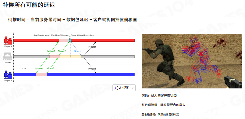 解决这个矛盾的核心思路是 延迟补偿(Lag Compensation):服务器收到“开枪”消息后,不用“当前世界”去算命中,而是回到射击者开枪那一刻应当看到的历史世界。