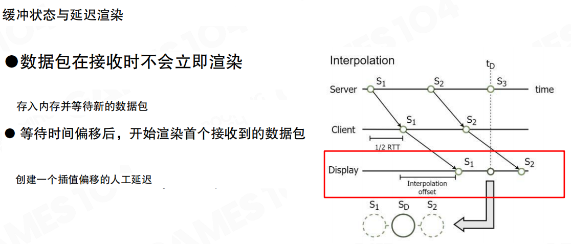 内插要想“稳”,关键是要有足够的控制点。一个常见技巧是 延迟渲染:把收到的包先放进缓冲区(buffer),人为引入一个插值偏移(offset),让显示时刻故意落后于真实时间一点点,这样你在渲染 (S_1\rightarrow S_2) 的时候,(S_3) 往往已经到手了。