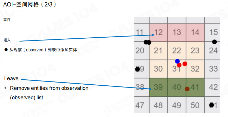 网格法通常用事件驱动维护”观察列表”(observed list):当对象进入/离开某些格子时,触发进入(Enter)/离开(Leave)事件,增量更新 AOI 列表,而不是每帧全量重算。