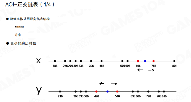 核心做法是分别在 X 轴与 Y 轴上维护对象的有序列表(双向链表或其它有序结构),并记录每个对象在列表中的位置。