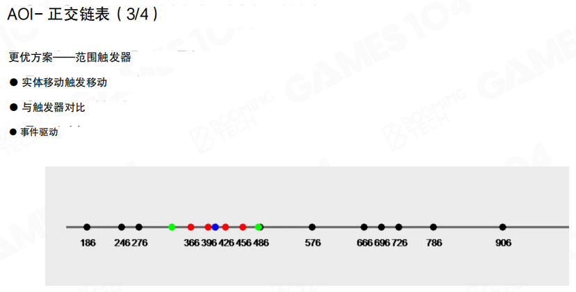 更进一步的实现会把”进入范围/离开范围”做成类似触发器的事件:对象移动时只会引发局部的顺序调整与事件派发,适合用来维护 AOI 观察列表。