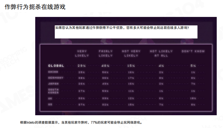 在线游戏里,作弊并不是”少数人的小动作”,而是会直接破坏匹配公平性与社区氛围,最终反噬留存与收入。图里给了一个很直观的结论:当玩家确认环境里存在作弊时,相当一部分玩家会倾向于退出。