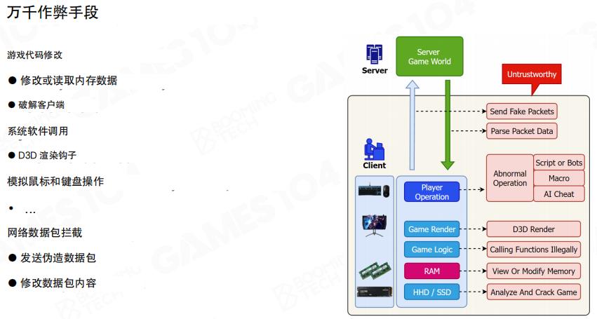 反作弊的第一原则是:客户端不可信。任何发生在玩家机器上的事情,都有被篡改的风险。