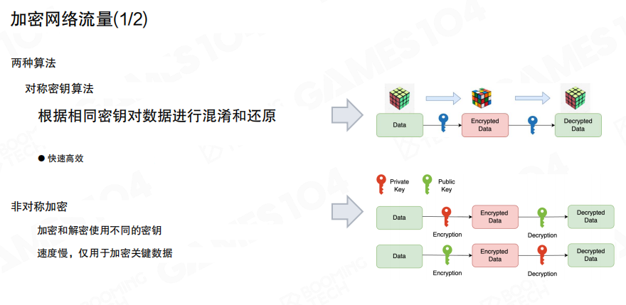 - 对称加密:加解密使用同一把密钥,速度快,适合大流量传输。