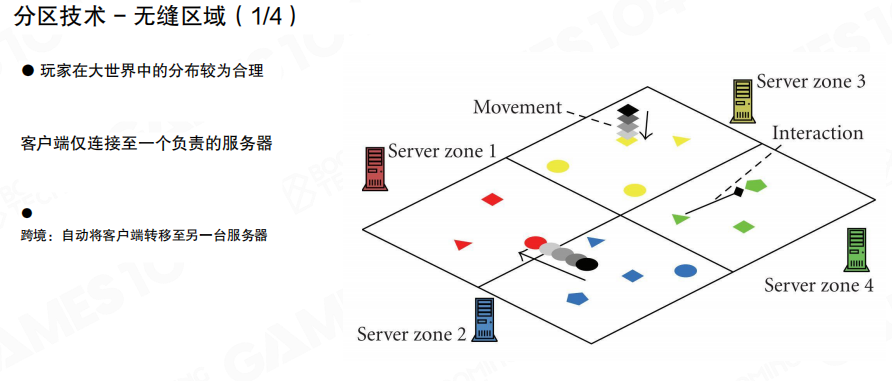 - 分区(Zone):把大世界切成很多块,每块由一个服务器负责;玩家在世界里移动时,会在服务器之间迁移。