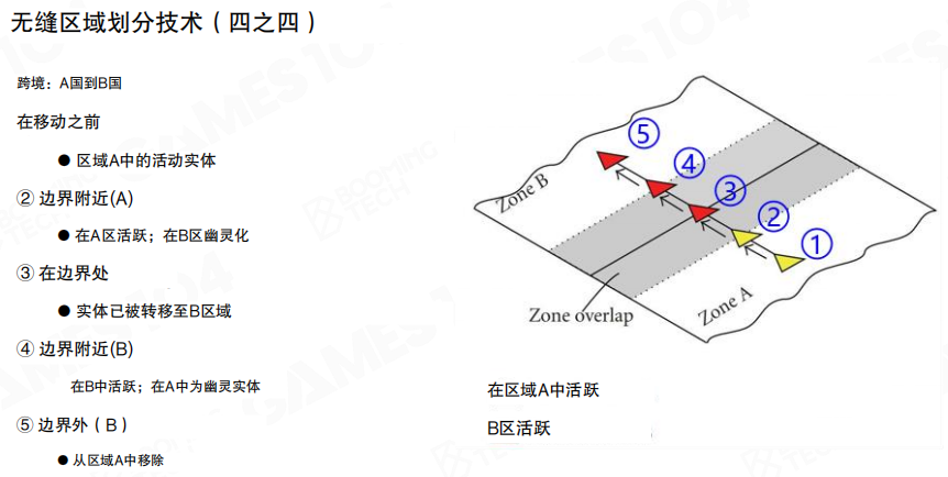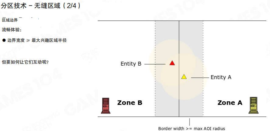 跨区最难的其实是交互:Entity A 在 Zone A,Entity B 在 Zone B,但它们的 AOI(关注区域)可能会跨过边界。